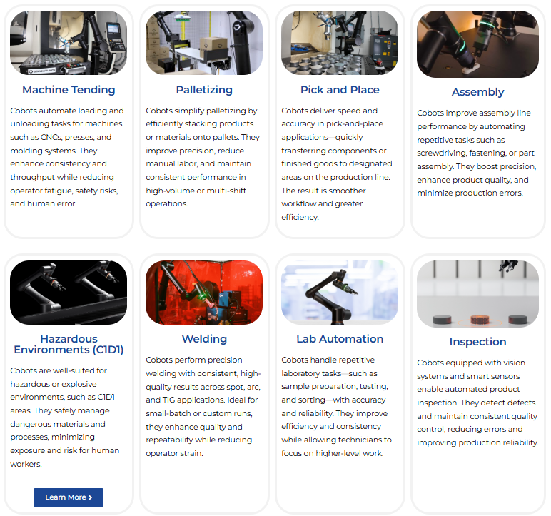Standard Bots cobots are highly versatile and can handle a wide range of tasks, including assembly, machine tending, quality control, and packaging. They excel in repetitive, high-precision tasks, making them an ideal solution for improving productivity and reliability in various processes.